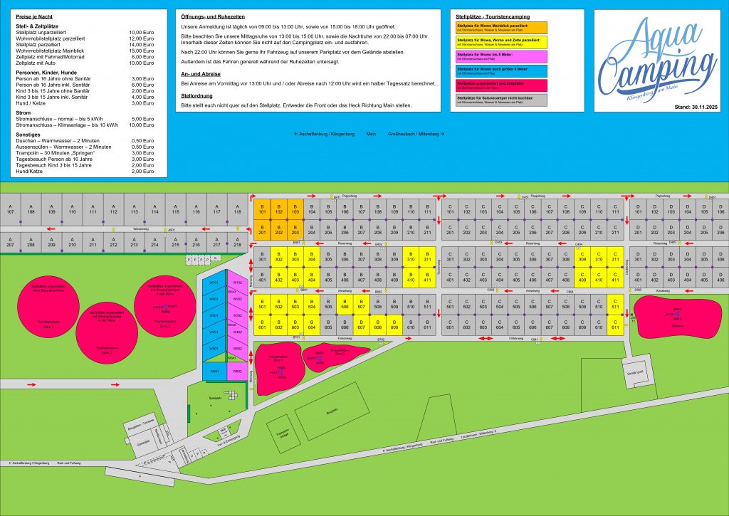 Lageplan Lageplan vergrößert – Touristenplätze Lageplan vergrößert – Touristenplätze – Legende Öffnungszeiten Anmeldung: Schranke:09:00 – 13:00 Uhr 07:00 – 13:00 Uhr15:00 – 18:00 Uhr 15:00 – 22:00 Uhr Kontakt Telefon: +49 9372 135 7387Mobil: +49 151 41 411 353Email: info@aqua-camping.de
